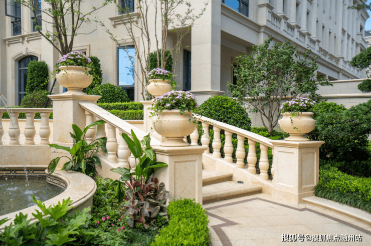 整个园区,以经典的绿城法式墅区景观大中轴贯穿,占地约1000多㎡,联排建筑的设计,融合了中国传统院落布局与法国枫丹白露宫的审美,外立面大面积采用全石材干挂,檐口等细节部位使用仿石。