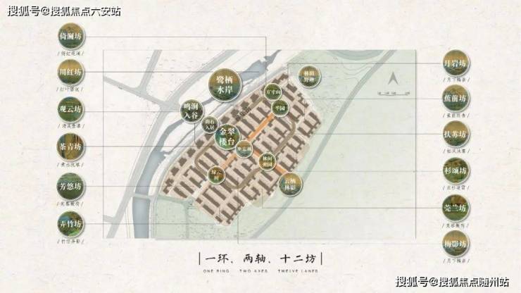 萃取《千里江山图》十二境,不同地势与原景,以主题花木与生活意趣打造不同情境的风雅十二坊,以游赏环步道与十字景观双轴串联,营造闲庭信步的恒美日常。