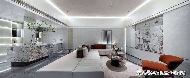 地下二层的会客厅是真富丽堂皇,大挑高的空间配上大吊灯,调性十足;高5.1米的巨型岩板使空间看起来很灵动。当然,所有装修风格以业主的主观意识为主,项目整体以毛坯交付,可以顺心而为。