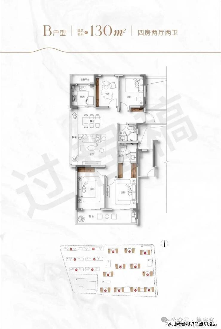 项目规划为洋房+小高层组合,其中小高层户型建面约105㎡、建面约130㎡,洋房户型建面约139㎡、169㎡,还有稀缺的建面约197㎡跃层。