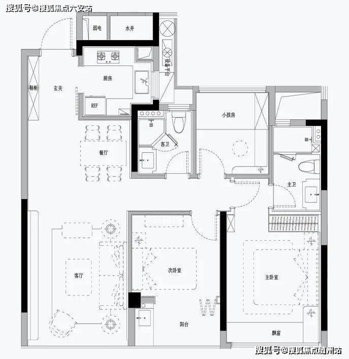 (建面约)97㎡的全明边套三房,是一个很少出现在边套的面积段,南向双联阳台宽约6.4米,堪称刚需户型中的超尺呈现了。