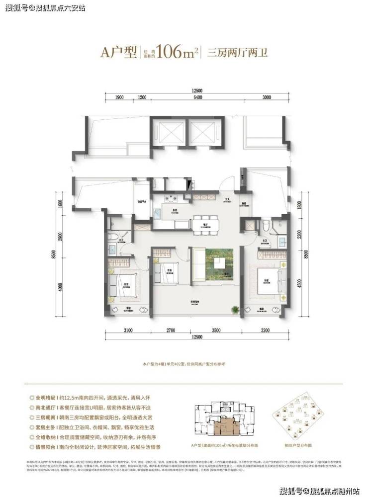 106-109㎡户型布局紧凑、功能齐全,是年轻家庭及首置群体的优质选择。其中106㎡户型采用四开间朝南设计,南向面宽达12.5米,全明卫户型。