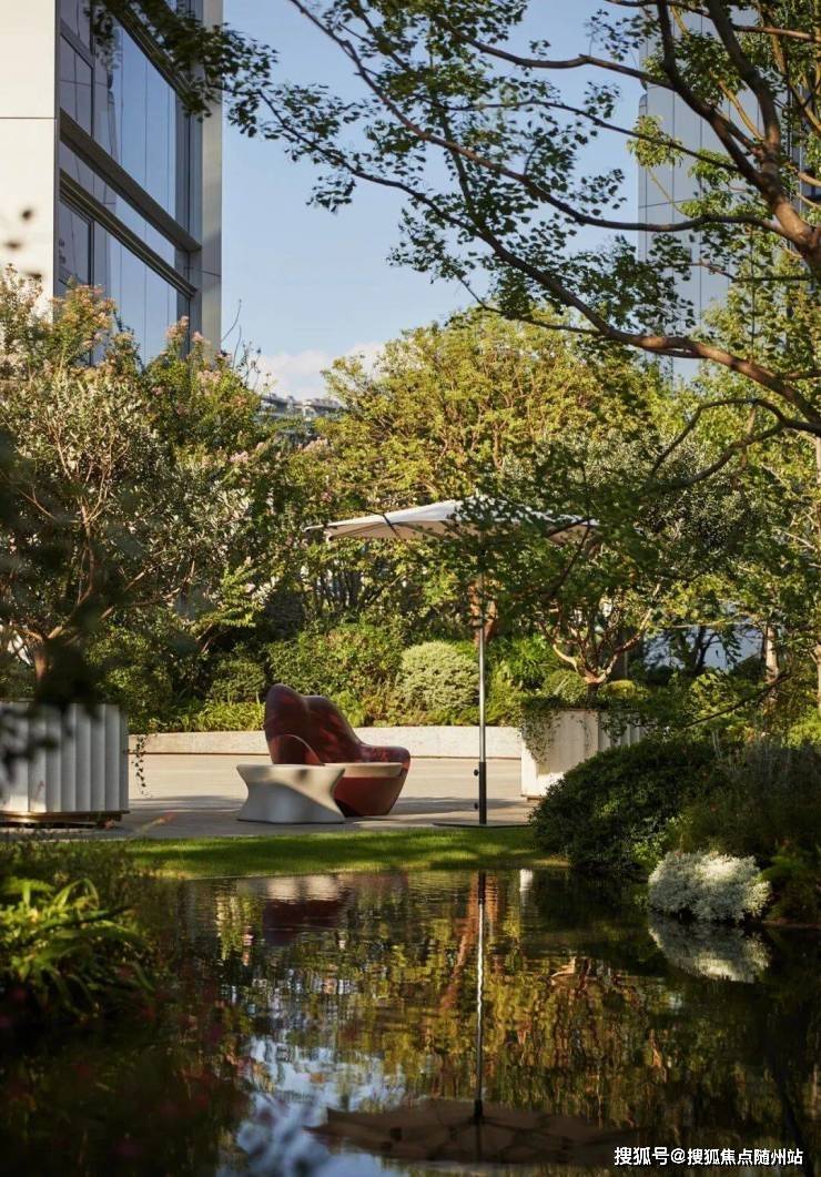 走入T-ONE潮博西区的园区,可以看到一条蜿蜒的水系串联着不同场景,贯穿整个楼盘。在这里,Pok是结合了杭州「钱塘江潮」的在地文化,用溪流与叠水打造出了一座很有度假感的花园。花园中,凡是有户外座椅的地方,就会有微风、树荫与水流的环绕。