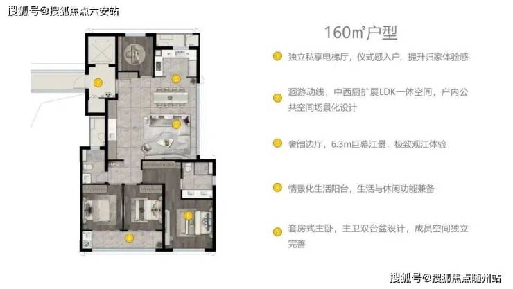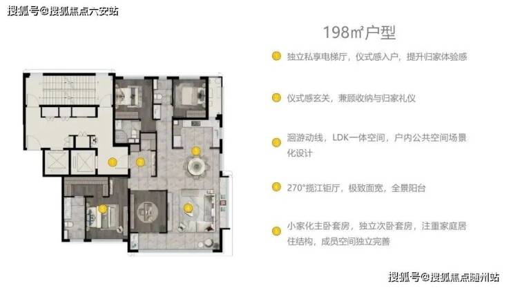 本项⽬楼王产品为198平⽶全景观江的端厅⼾型,通过南向阳台、东向飘窗的组合,使客餐厅区域获得了270°的全景观江视野。超大的玻璃窗分格设计,旨在使奉化江的美丽江景能尽收眼底。