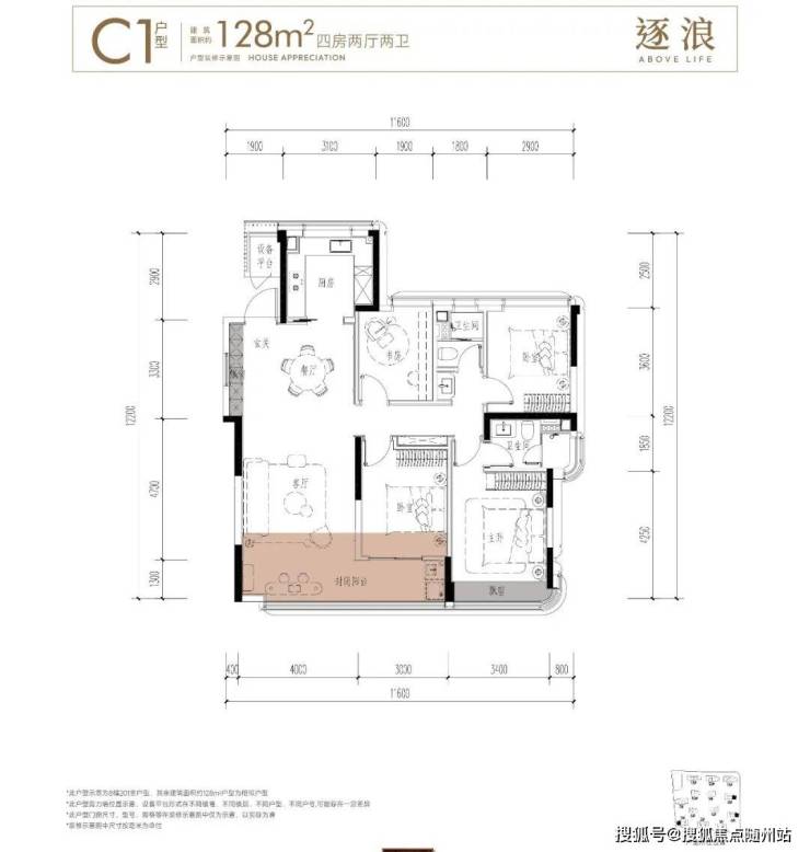 128㎡为边套户型,三开间朝南,南向面宽约11.6米,餐客厅一体化设计,整体空间感较为开阔。