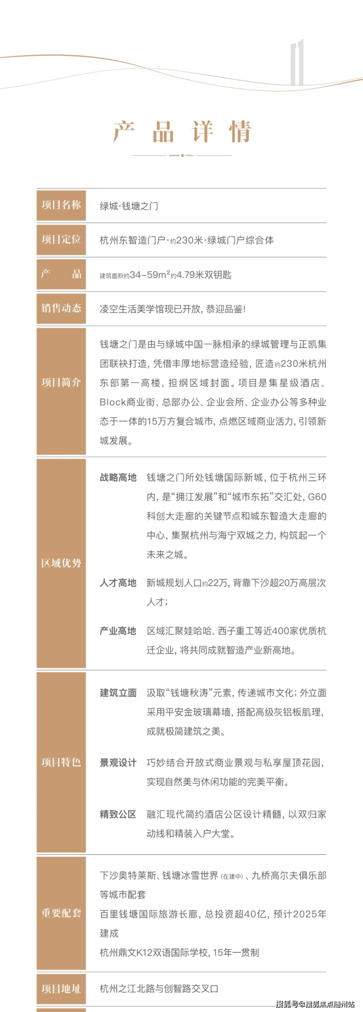 绿城钱塘之门🏠🔴🏠总建筑面积约15万方的复合城市,由1栋230米超高层和2栋高层组成,业态包括星级酒店、Block商业街、总部办公、企业会所、企业办公和精装双钥匙。
