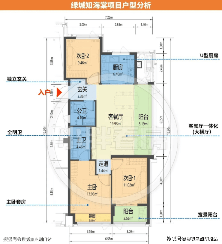 106方的起步户型,居然做了4开间朝南,南向3个房间,整个南向采光面达到了约12.5米。