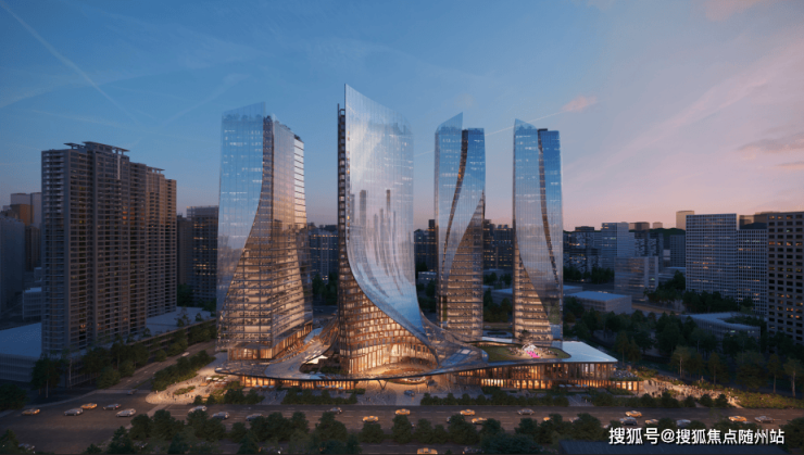 整个建筑群的布局沿着奔竞大道展开,由四栋塔楼和附属的酒店配套裙房共同组成。这个 26 万平方米的综合体项目,由七位行业大师联袂打造,其设计的核心理念是将国际化大师的智慧结晶、艺术性生活表达和杭州本土文化的融合,创新出一个独一无二的“城市会客厅”。