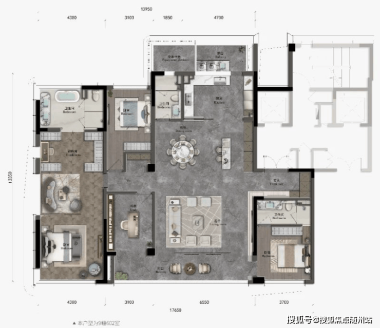 多套房设计:188㎡以上户型实现四房三卫全套房,主卧含双衣帽间、景观浴缸。