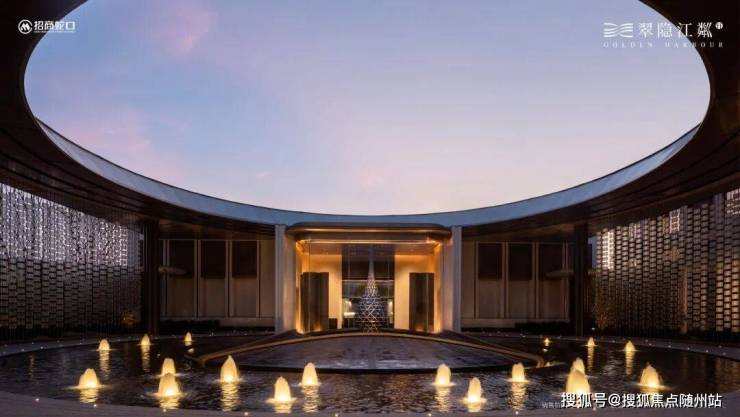 穿过大门,前场水院豁然展开,整体面积约660㎡,设计取意“天圆地方”,中央点缀水滴造型艺术雕塑,营造出强烈的归家仪式感与沉浸体验。