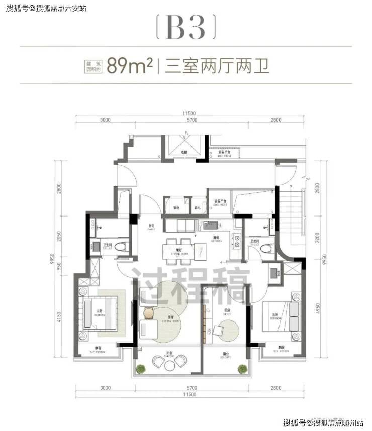 建面约89㎡实现三房两卫、四开间朝南格局,面宽达11.5米,得房率91%。采用LDKB一体化设计,南向书房可与客厅打通形成约5.7米超级方厅,半开放式厨房实现“岛台自由”,媲美市面120㎡户型功能。