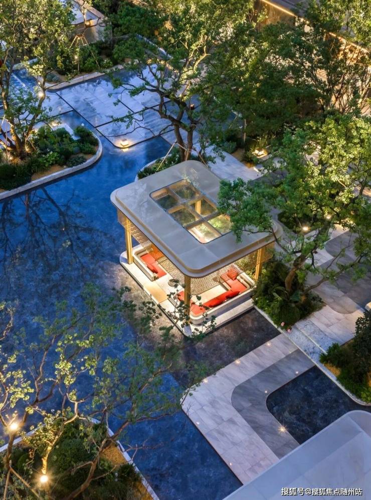 站立于台地之上,知海棠水景沿土地形态形成瀑布、镜面、溪涧等多重形态,浮岛客厅处设置休憩卡座,与前厅形成光影对话,如同三潭印月一般,映于湖心之上,抬高的湖心亭设计,成为舒展园区的一道风景线。