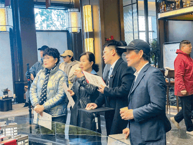 调研团抵达时,即便处于工作日上午,荷语江山府营销中心内客户依旧络绎不绝,沙盘前、洽谈区及样板间均聚集着前来参观、认购签约的购房者,足见红盘爆棚人气与超高热度。