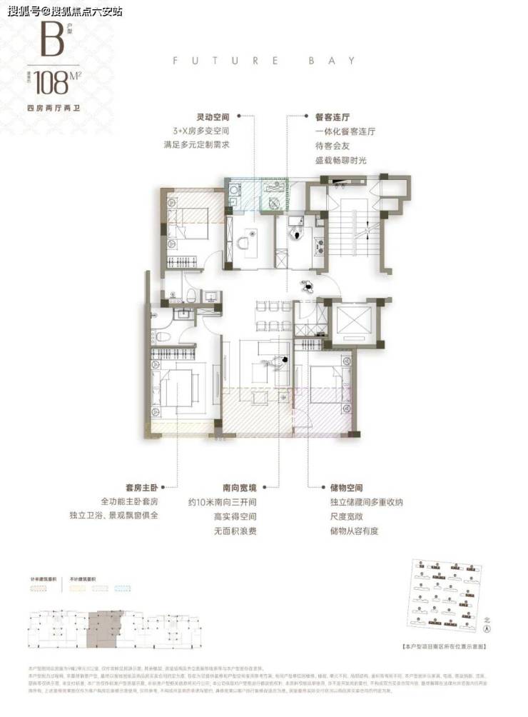 建面约108方户型:教科书级的模板,尺度空间表现十分亮眼。
