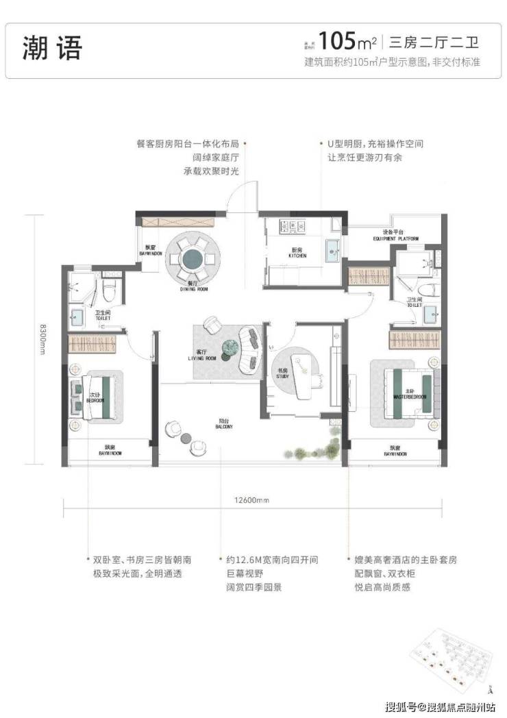建筑面积约105㎡实现四开间朝南,约12.6米南向面宽,主次卧类双套房设计,颠覆市场对空间尺度的想象边界。