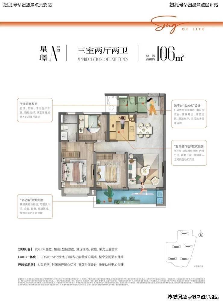 约106㎡户型点评:双联阳台约6.7米面宽,加设L型俯景面,满足晾晒、赏景、采光三重需求,LDKB一体化设计,打破各功能区域的隔离,整个空间更加开阔,开放式厨房 U型厨房,封闭敞开随心切换,高效台面设计,操作动线更加合理