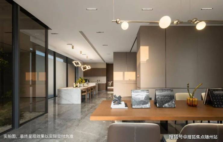 餐客厅一体化设计,顶部做了悬浮顶+无主灯设计,再加上客厅全木纹饰面,大气而又温馨。