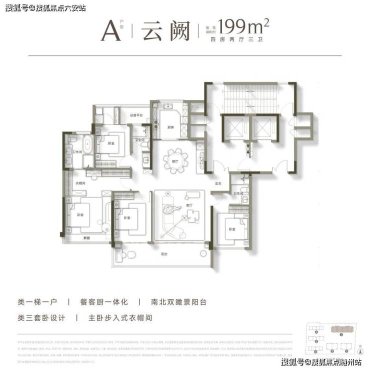 受欢迎的南厅户型199㎡A的户型比较经典。首先,三房朝南,套房平权。