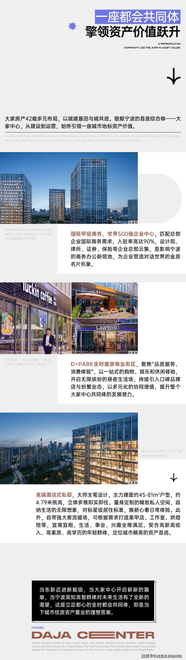 品牌房企 百强大家房产:39载大家房产,蝉联“中国房地产百强企业”称号,敬献“杭派精工”品质!历经3载时间沉淀,同样被大家房产注入品质生活方式,创造性地兑现“D+Park商业街区、奢雅酒店、定制领寓、花园式办公写字楼”一体垂直生长,“文化、生态、社交、潮流”元素塑合的都会综合体,挚献宁波不止于自然,更包罗万象的先锋生活。