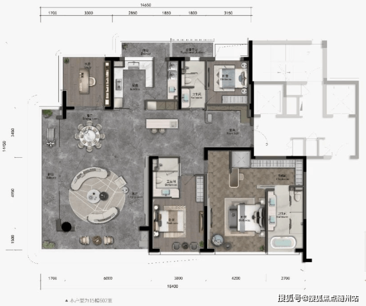 建面约188户型,4房2厅3卫 ,层高约3.2米。亮点包括一梯一户的单独入户、玻璃展开面约27米、主要空间全部为落地玻璃、朝南双套房设计;南北双阳台设计,南向总开间约16米,南阳台8.9米,5.9米的大宽厅、餐厨一体化的面宽达4.8米;转角玻璃阳台、浴缸和主卧。