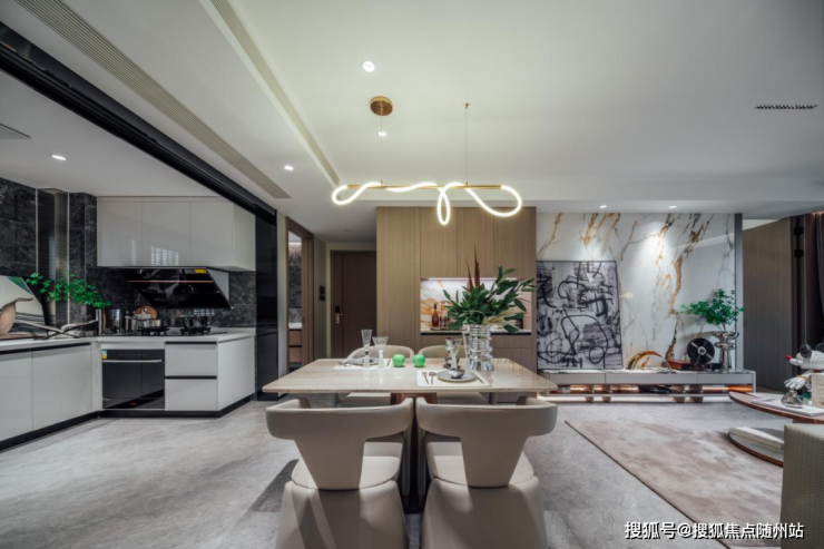 餐、客、厨同宽的贯通式设计,让整个室内空间更为宽敞,也让未来家庭交流、孩子玩闹更为轻松写意;超宽的U型厨房同时站三个人,也丝毫不会感到拥挤。
