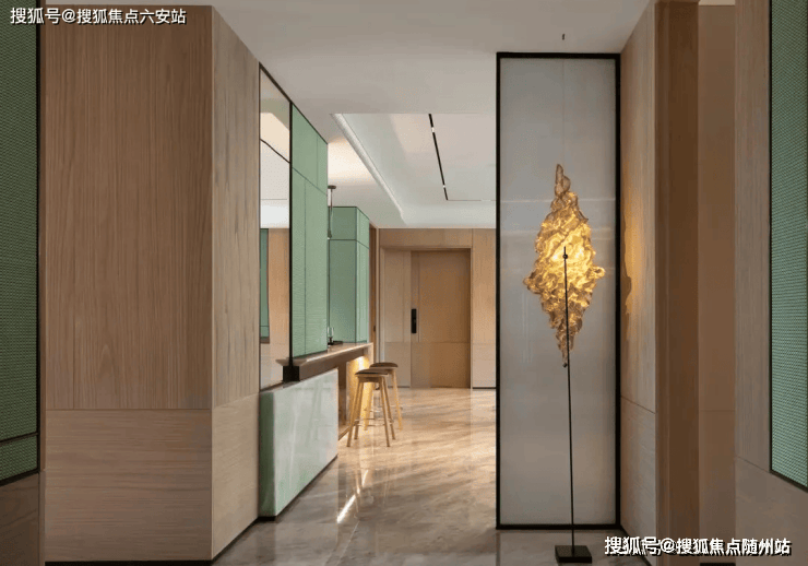 东区建面约320户型,将艺术感进一步融入日常中。特别设计的专属门厅空间,是从电梯厅延伸到家,如同一处艺廊,放慢人的情绪;室内选用了浅金色奢石(外界也称其为“芬迪白大理石”)作为主要的石材,曲面的木饰面也为浅色,整体给人以明亮感。