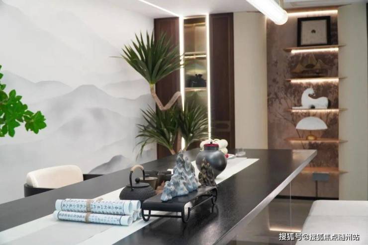 另一侧的现代感工作台,与中式茶室风格不同,却又奇妙地融合在一起。现代简约的设计搭配充足的光线,无论是醉心创作还是处理工作事务,都能沉浸其中。