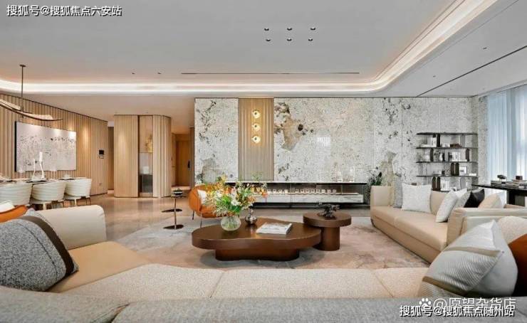 东区建面约320户型,将艺术感进一步融入日常中。特别设计的专属门厅空间,是从电梯厅延伸到家,如同一处艺廊,放慢人的情绪;室内选用了浅金色奢石(外界也称其为“芬迪白大理石”)作为主要的石材,曲面的木饰面也为浅色,整体给人以明亮感。