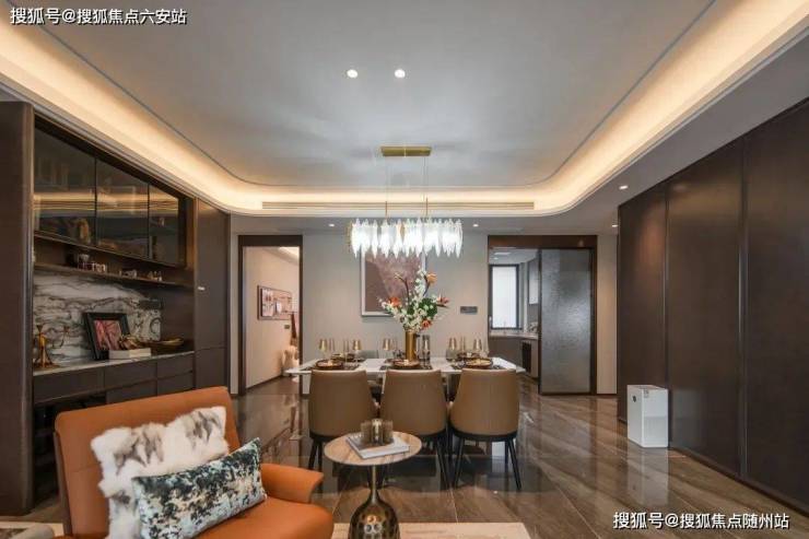建面约310㎡的边套,首层南向横厅面宽就达到了约6.9米,厨房面宽约5.5米,可以阔绰地分出中西厨;
