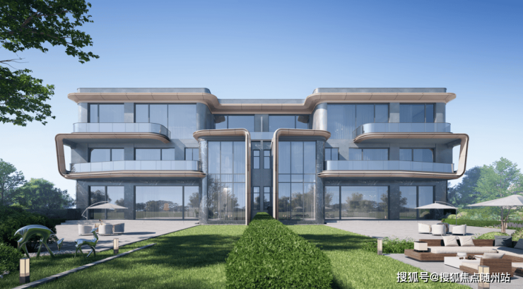 · 流光曲线|定制奢感立面:灵感源自劳斯莱斯Coachline游艇的流线型设计,搭配LOW-E玻璃幕墙、印度宝蓝石石材与铝板,金灰配色高级大气,远看如扬帆游艇,近看细节考究。