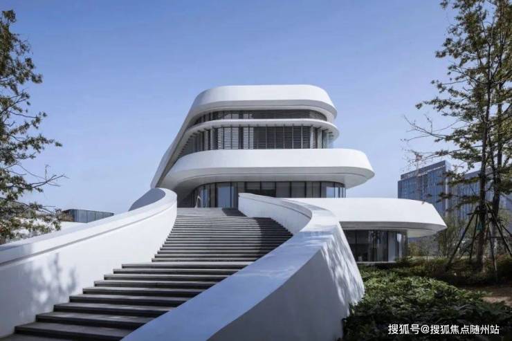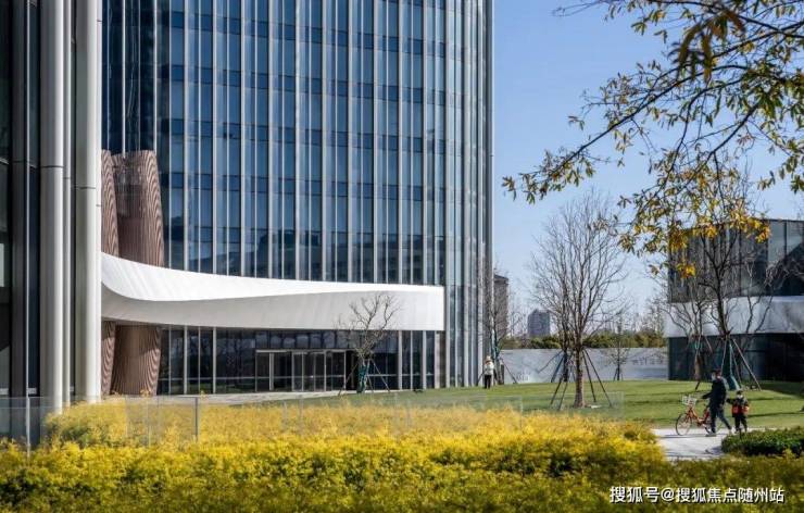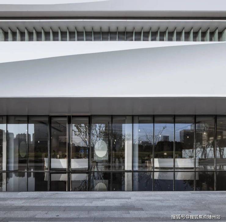 建筑造型简约内敛,表皮随着光线的折射而呈现出极具流动性的线型变化,纵向展现了钱塘江潮汐的涌动与起落;而低层的建筑群则在水平向上延展,建筑的触角抵达地面景观,并延续其明晰而丰富的立面韵律——它们仿佛是一组跳动的城市音符,呼应着自然中气势磅礴的潮汐变幻。