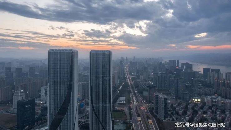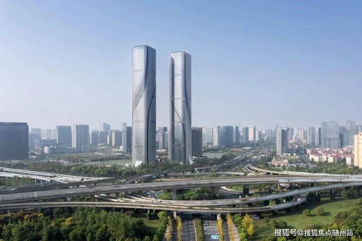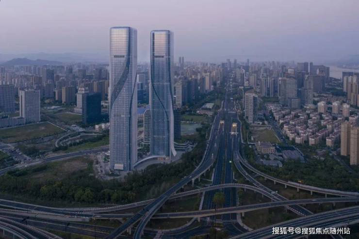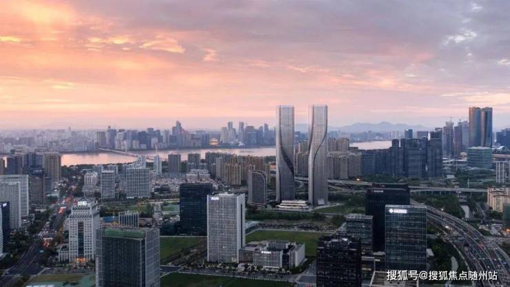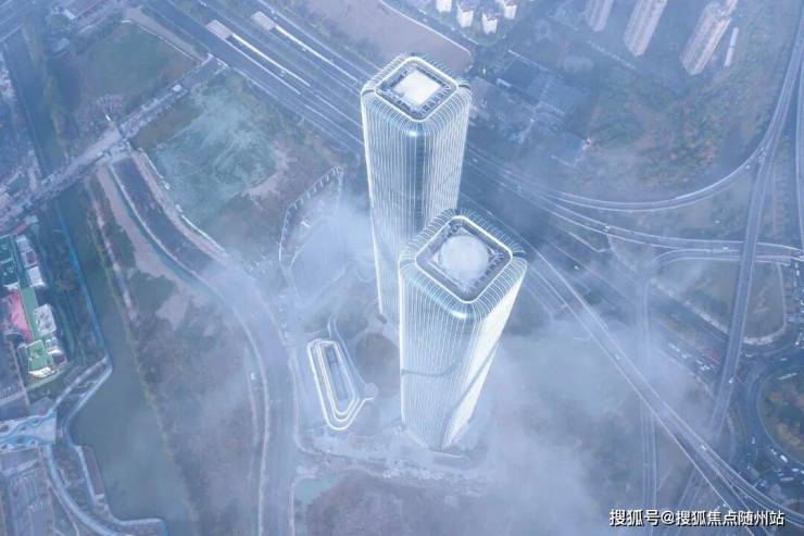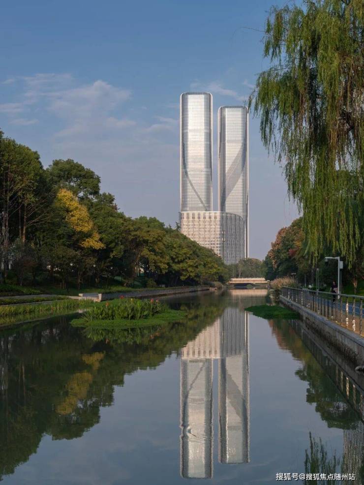 两幢超高层建筑与高层公寓、多层配套辅楼交相呼应。设计从建筑的在地属性出发,将钱塘江奇特的潮汐现象以抽象的手法提炼出来,以建筑形态模拟钱塘江潮起潮落独特的大美风姿,形成一组优雅而富于动感的城市雕塑。