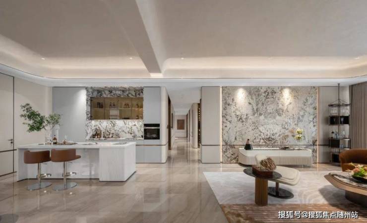 客厅背景墙用了一整面的玉翡翠,玉石的清透典雅带着远古冰川裂纹的幽深。双岛台的设计,是闺蜜下午茶的悠闲时光,美诺九件套,是爸爸带女儿下厨的鲜美飘香。三米的长茶台,茶韵悠长,十人的大圆桌,欢聚一堂。