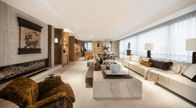 户型参考漆砚制作方式,以“玉德”显质地,以“金声”隐赞誉,主卧吊顶还原砚台之形,以漆砚般闪耀琢序空间。 取陶砚之自然璞实感,雕琢白冰玉的背景墙,客厅吊顶还原砚台造型,室内饰以瘦金体笔划装饰线条。