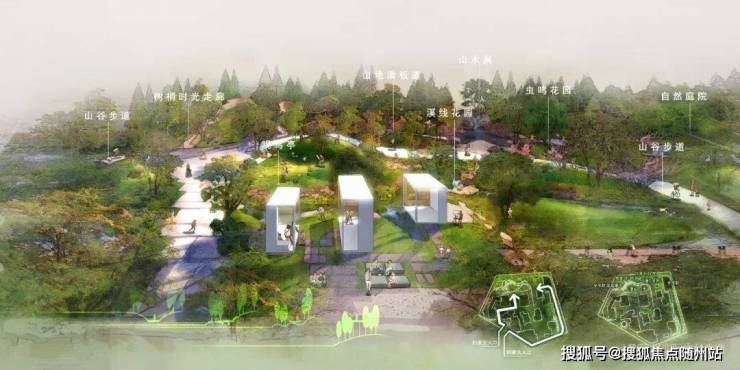 一条溪流串联起孩子的植物认知探索场(虫鸣乐园)、观鸟与溯溪的驻脚点(踏水涧)、自然与优雅的谧境(冥想花园)、森间空中漫游秘境(丘之境)、家族社交的野奢欢聚场(谷地聚场)与儿童森林一起成长的童话天地(云谷乐园)。