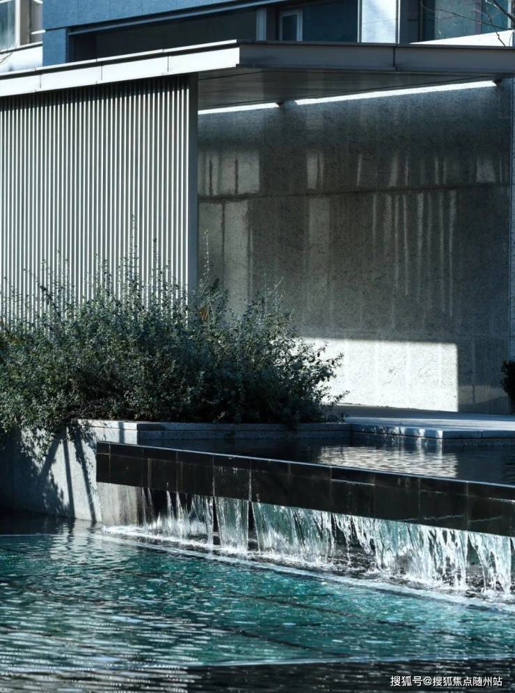 从两侧围着水景、顺着爬山阶梯一般的台阶漫步往上,在跌水的终端是卡洛斯卡帕式的雕塑出水口和一棵中型落叶乔木作纪念性空间;