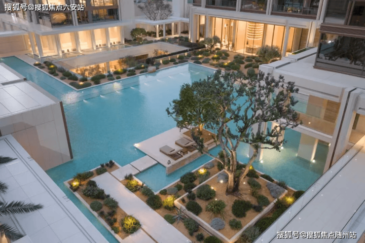 项目借约9米高差打造局部抬板社区,营造层次丰富的下沉景观庭院。园林以杭州唯一地中海风格为特色,蓝调泳池、低饱和度石材、旱岩植物、莱姆石通铺组合,呈现极简度假风,与板块内传统园林形成鲜明差异。