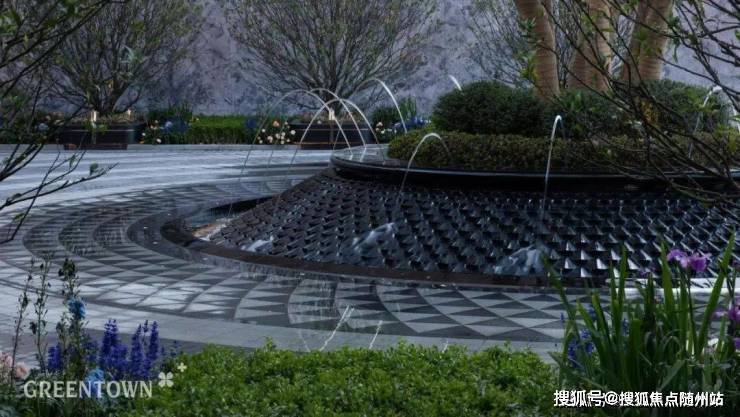 在门廊之前,绿城更是不计成本地落下四组叠瀑水景,涟漪生花;中央水景以潘多拉奢石为底;落客区的地面也采用了扇形石材铺装……