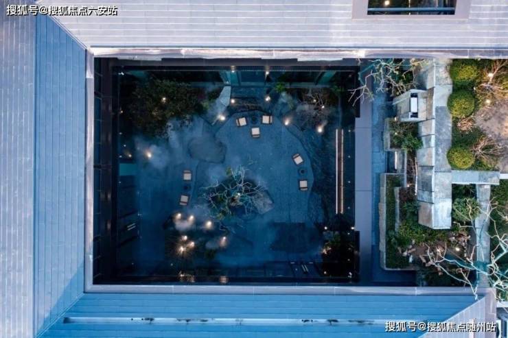 穿过景墙是下沉水院,连着售楼大厅和松林剧场,一边是水瀑潺潺,流淌成一幅古雅的宋韵山水画卷,一边是肆意舒展的罗汉松、老红梅、羽毛枫,铺展出悠远的东方意境。