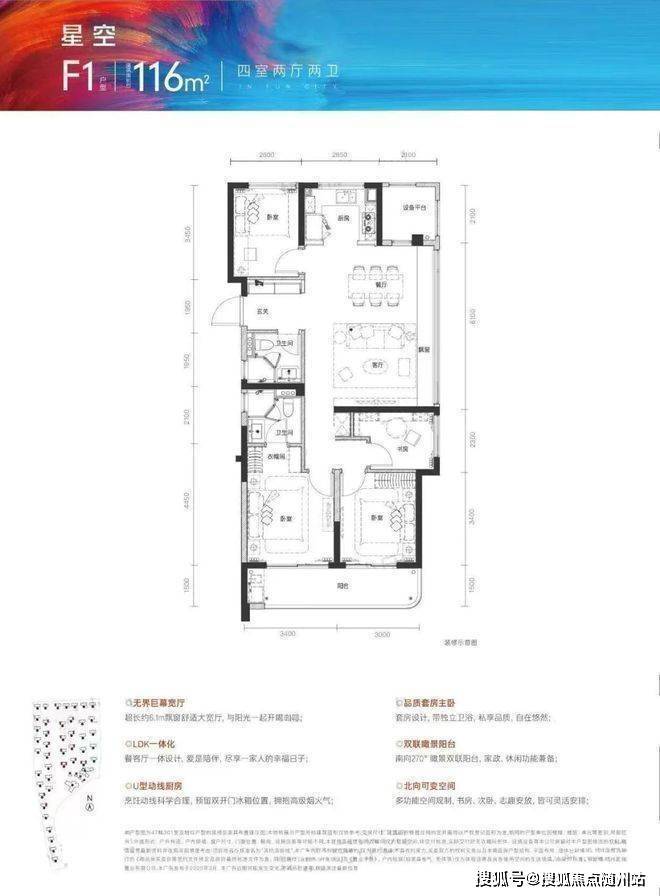 独立玄关收纳南边套房主卧带走入式衣帽间+独立卫浴+飘窗南向约6.4米面宽,带阳台,U型厨房带大开窗,餐客厅一体带约5.8米超长飘窗……该户型更具有生命力。