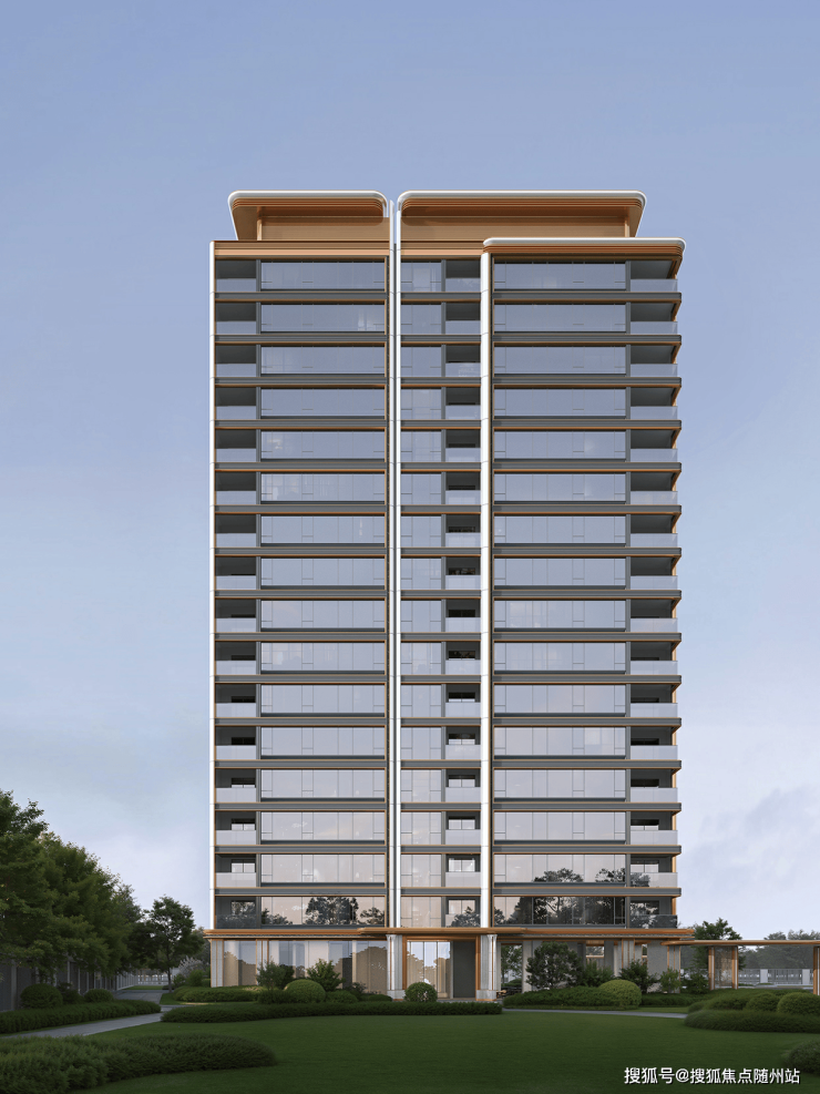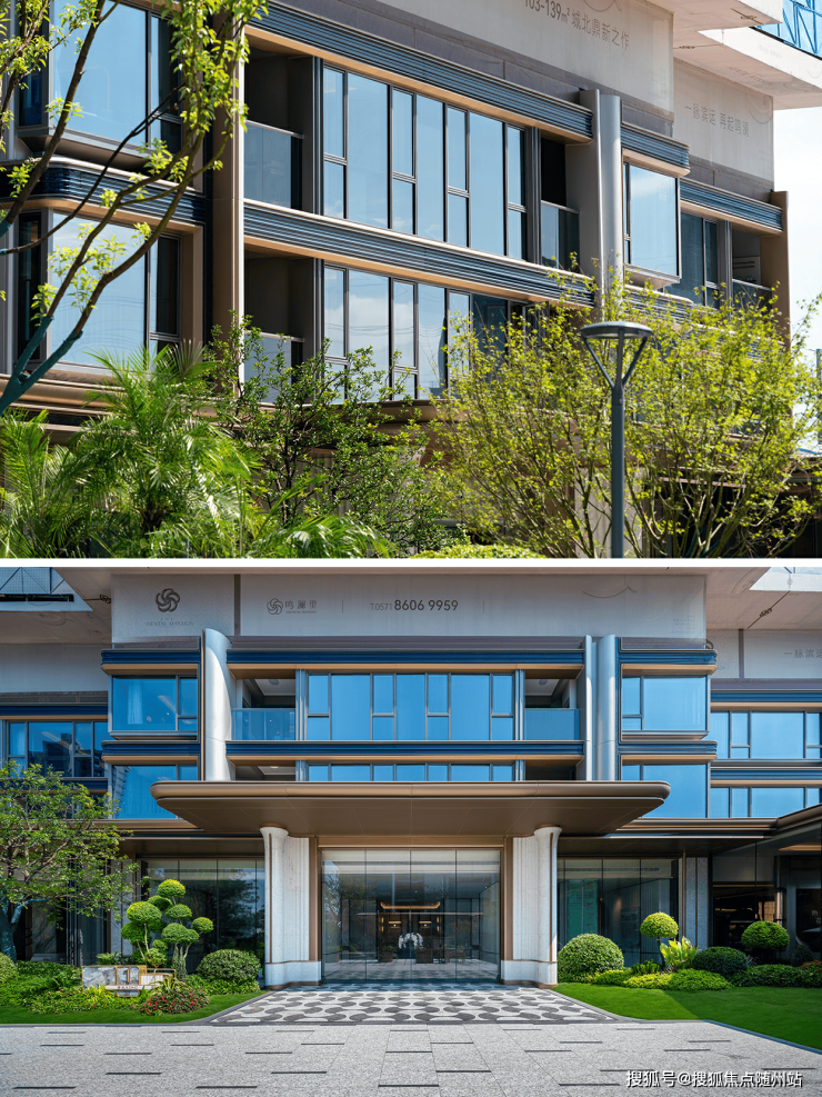 主体建筑运用大面玻璃、铝板、铝线条和石材等为辅描绘“金色画框”,顶部融合比例美学与圆弧转角工艺,勾勒超流线动感“云冠”造型。建筑层间以“景泰蓝”千年艺术为灵感,辅以层层线脚形成独特的东方美学语言,蓝金组合彰显华丽。呼应在美学空间的生活场域中,构建出轻奢尊贵的建筑气质,每一处设计都诉说着关于家的高阶想象。