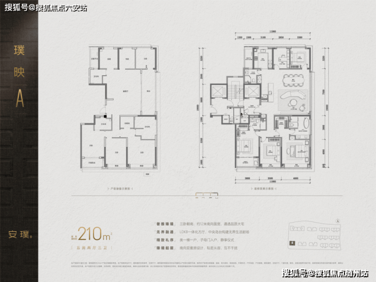 在户型设计上,安璞同样表现出众。约210㎡户型为五房三卫,其余户型均配备四卫,并实现三间套房布局,极大提升了居住的私密性与舒适度。