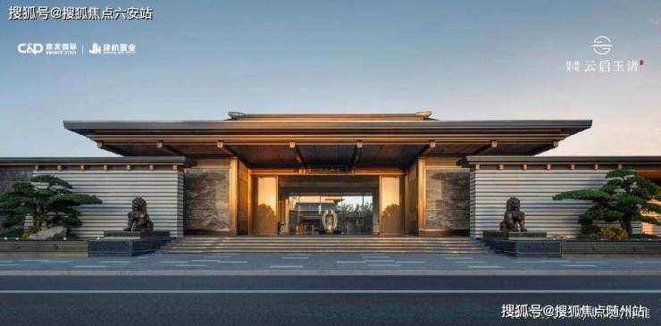 ◎ 太和殿同款形制约68米宽恢弘大门▪︎▪︎▪︎▫︎▫︎▫︎屋檐取形北京太和殿庑殿顶,融入良渚高台夯土文化,搭配铜狮、涌泉、五步青云阶,辅以琮黄色调装饰,营造归家非凡礼遇。