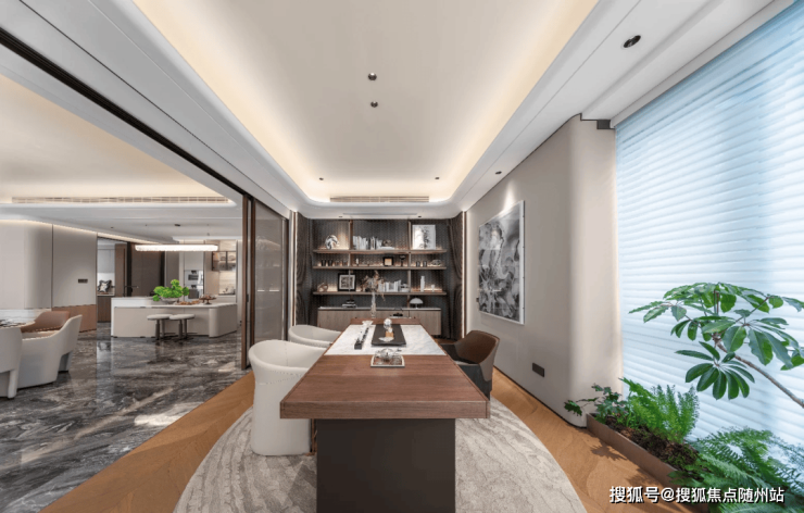 一楼设置了知遇客厅、无舍书、文澜书院、沐光雅厅、璞隐雅室、寻味厨房等功能空间,成为了业主们的公共客厅。这里的设计与用材都充满了品味和质感,给人一种高贵典雅的感觉。每一个细节都经过精心的雕琢,仿佛在这里生活就是一种艺术。