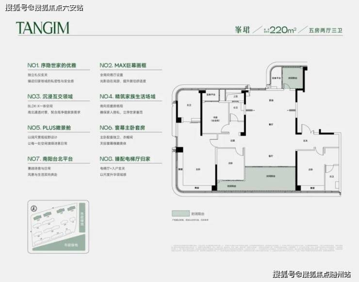 全系户型标配“类一梯一户”独立电梯厅、南北双家政空间及270°环幕飘窗,主卧套房融入L型衣帽间与明卫设计。220㎡户型更实现南向双套房,兼顾家庭互动与成员隐私。