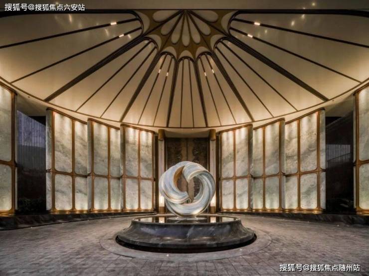 主入口采用约9.6米高黄铜大门(朱炳仁团队手工锻造),搭配11.5米酒店式落客门厅及百达翡绿奢石屏风,以“折扇”“钱塘潮纹”等元素诠释江南文化。