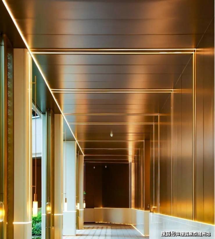 在风雨连廊的材质运用上,讲究材料的质感与空间的气场,大量石材、金属、线条、灯光的巧妙结合,演绎出浙江中南控股集团的先锋感与精工感。