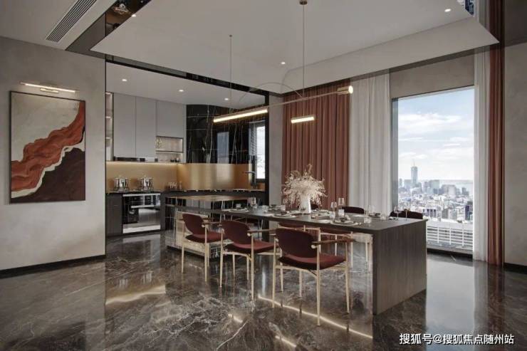 LDKB一体化布局:10米横厅连接中西双厨,弧形岛台提升30%空间通透感,可承办私人宴会或家族聚会。