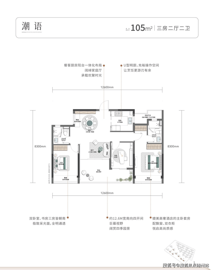 • 突破性设计:105㎡南向四开间,南向面宽12.6米,实得约120㎡。