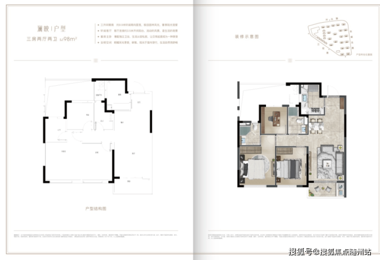 起步格局就是三房两卫。约98㎡中间套,南向面宽近10米,三开间朝南,客厅连着一个约3.5米宽的阳台。我数了下,整个户型可做到7面通风采光,包括两个明卫。